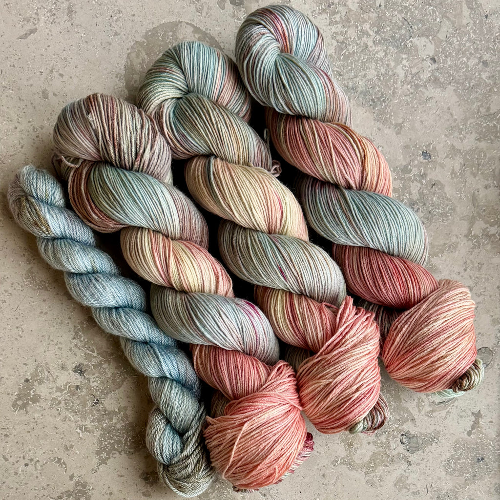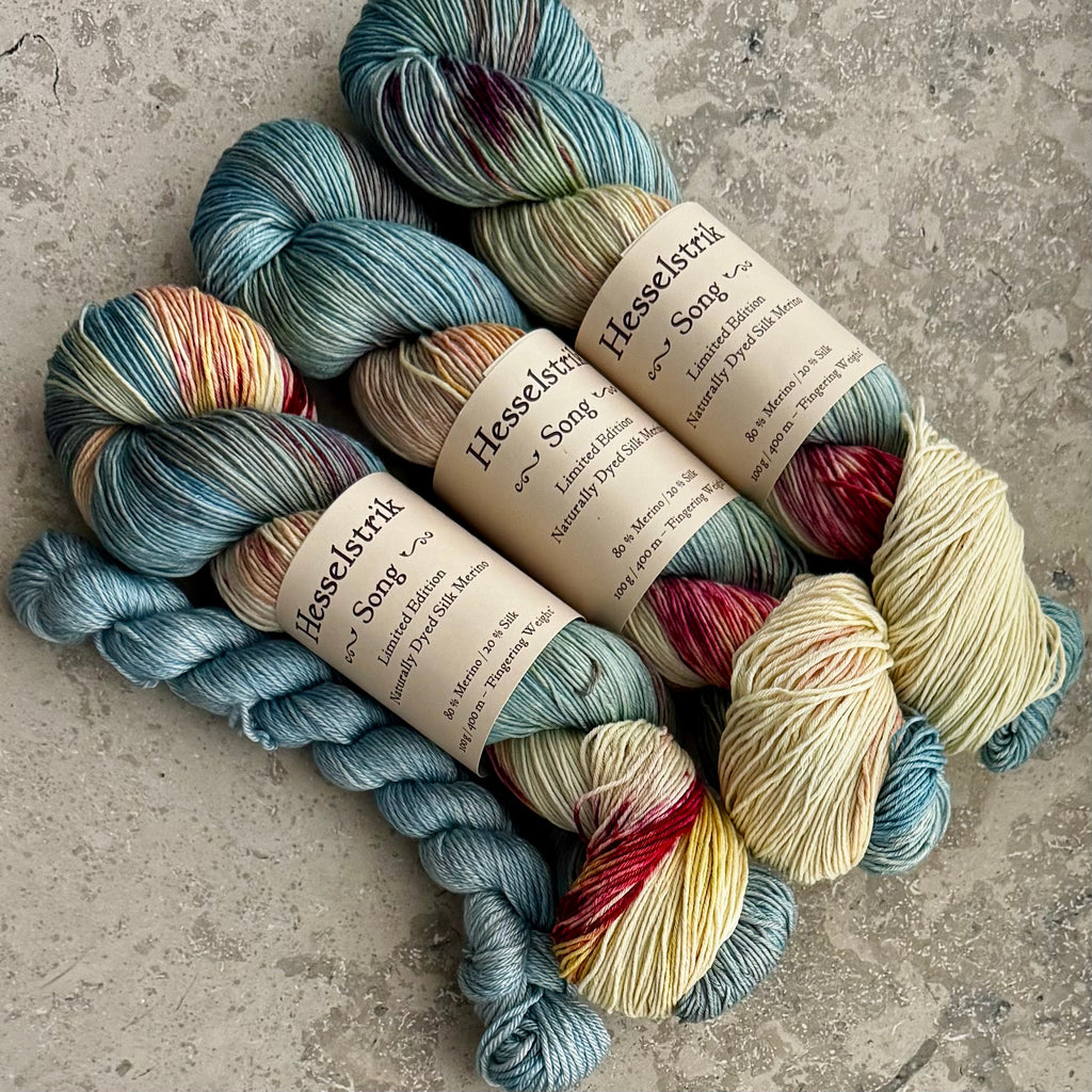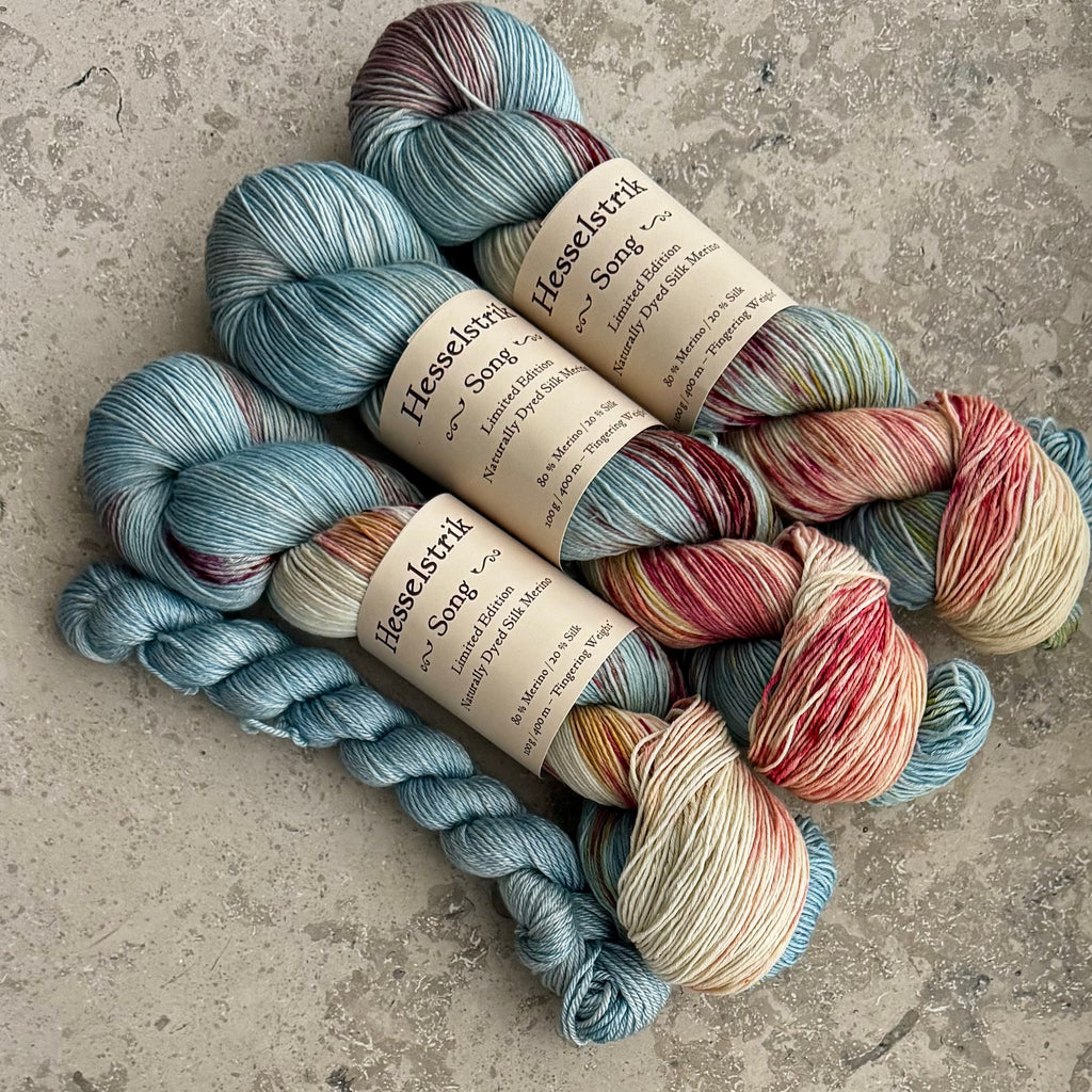 En t-shirt med små blomsterknopper, der er skabt af assigned pooling. Strikket i Hesselgarn Song, men med halskant og opslag i Silk Song (mini fed)