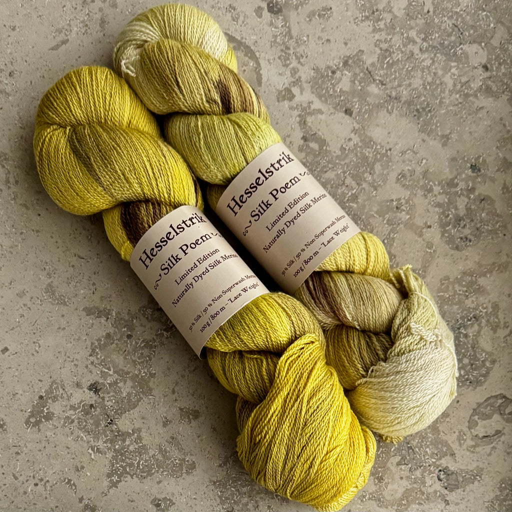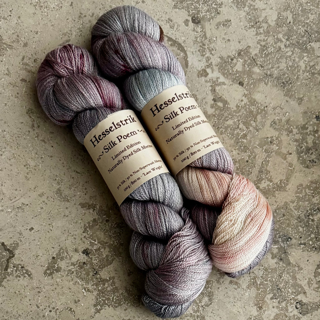 / 100g 225m) og Hesselgarn Mulberry Mini (100% Mulberry Silk, 20g/80m)