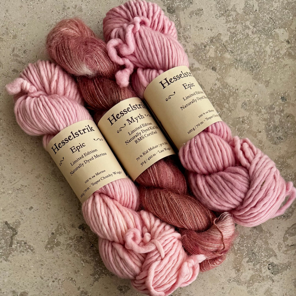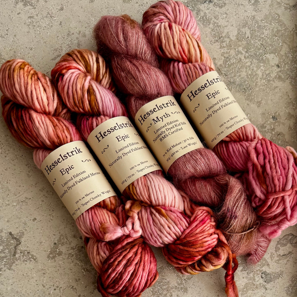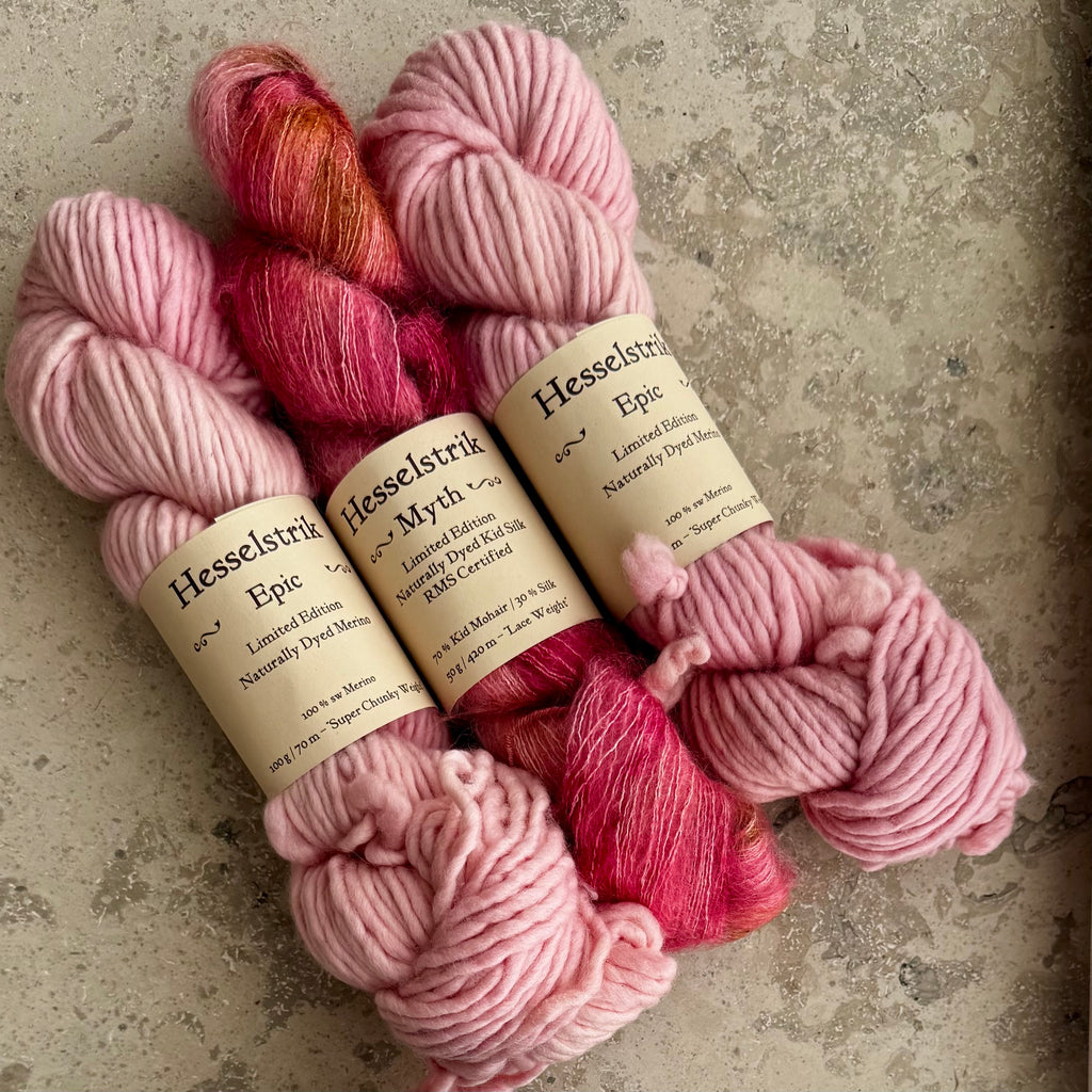 - Hesselgarn Epic Merino Single 100/70m + Myth (model vist i fv Peckish Flamingo og Peckish Flamingo) (Originalgarnet)