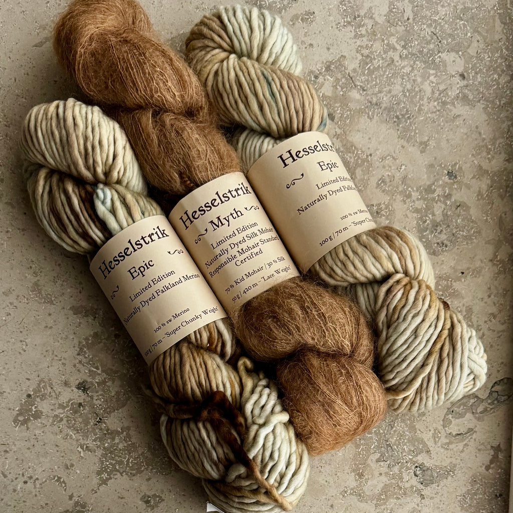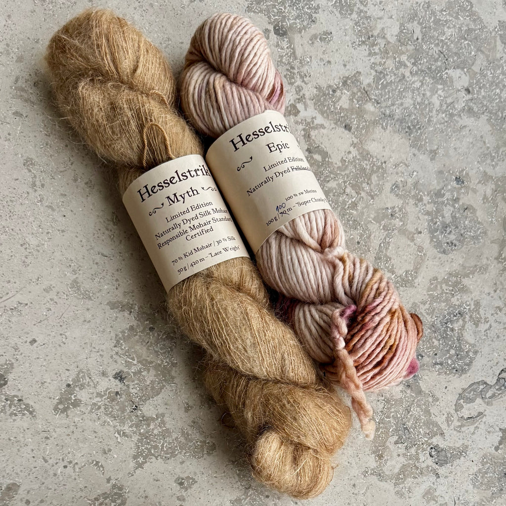 - Hesselgarn Epic Alpaca (2-trådet) 100g/100m + Myth (model vist i fv Demetrius og Cleopatra)