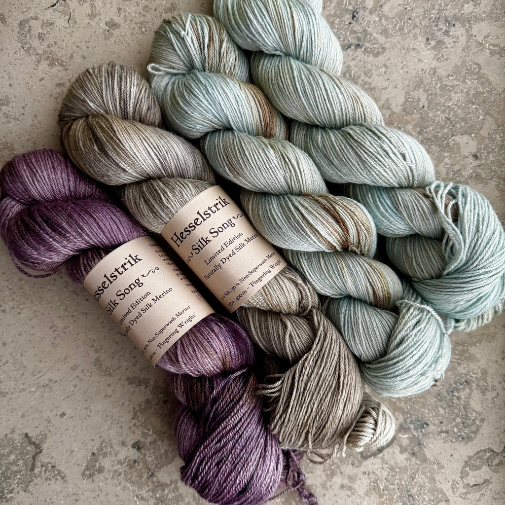 Strikkes i Hesselgarn Silk Song, et superblødt non-superwash garn i 50/50 merino/silke, 100g/400m