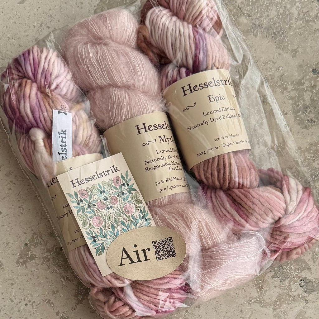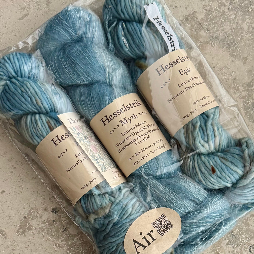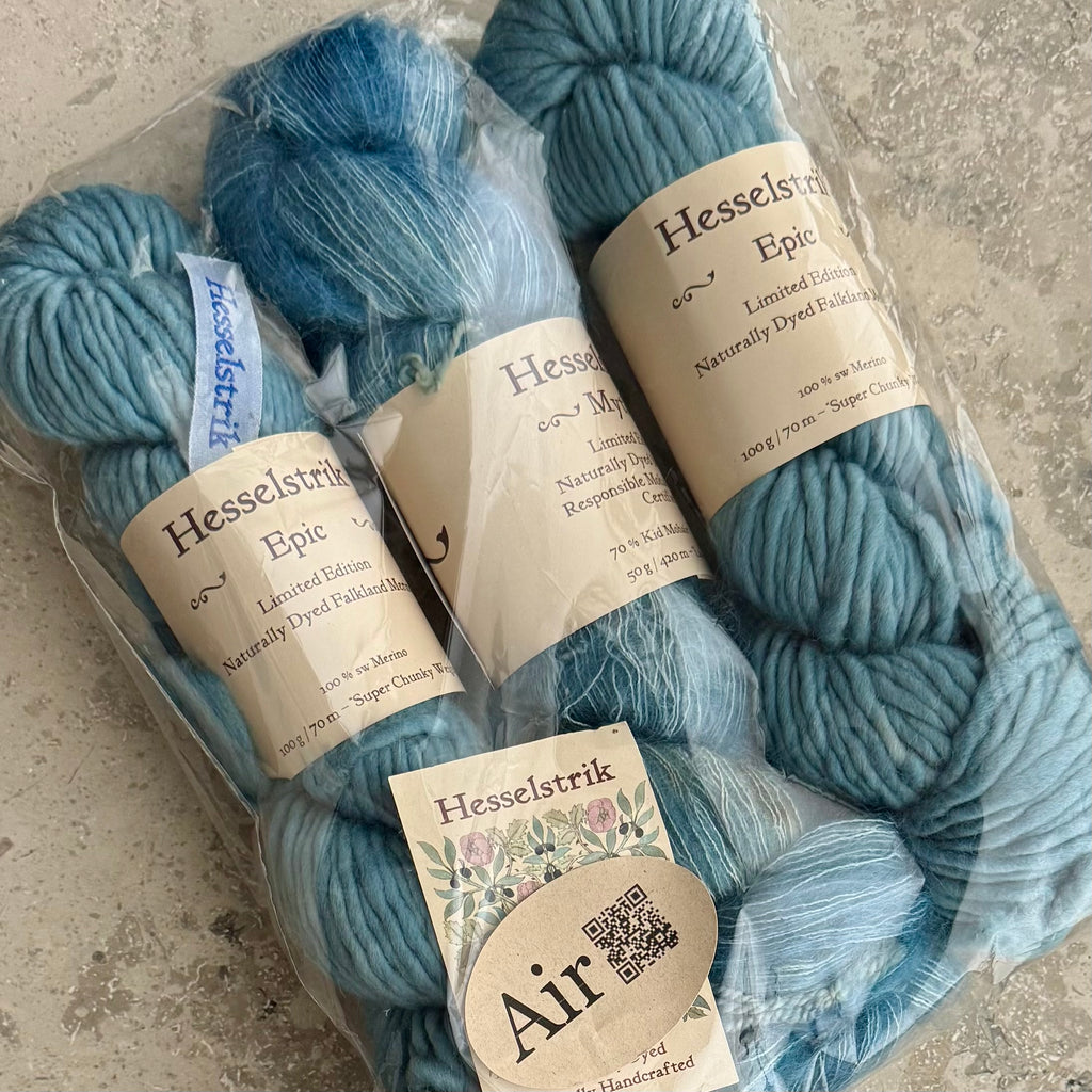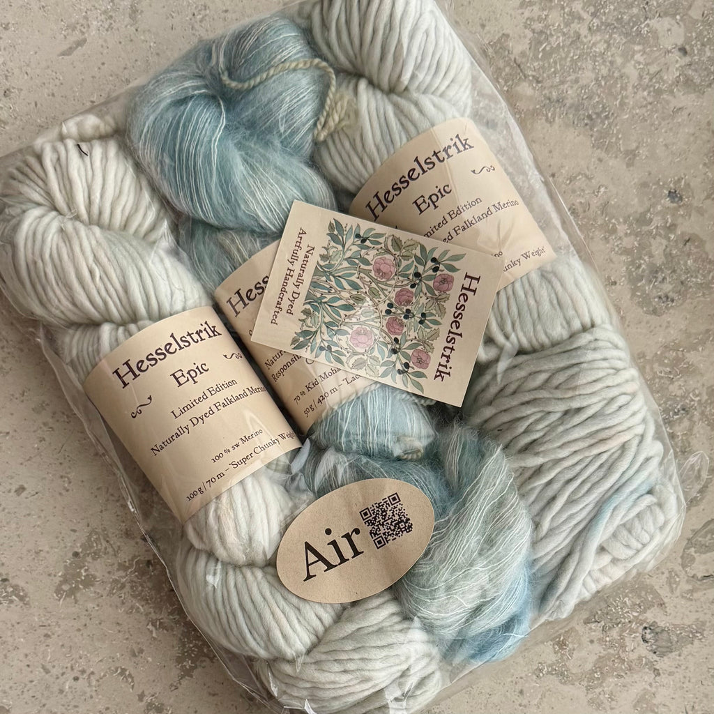 Air - den letteste, luftigste bluse i en kombination af chunky weight garn og lace weight garn. Designet af Lisa Renner til det superbløde Hesselgarn Epic (chunky sw merino) og Hesselgarn Myth (RMS certificeret silkemohair).