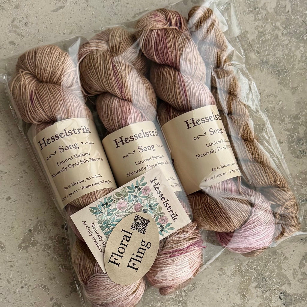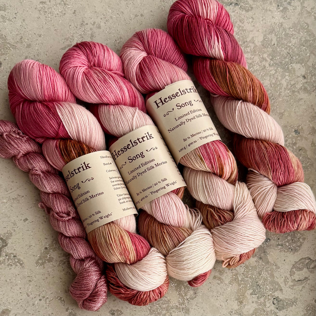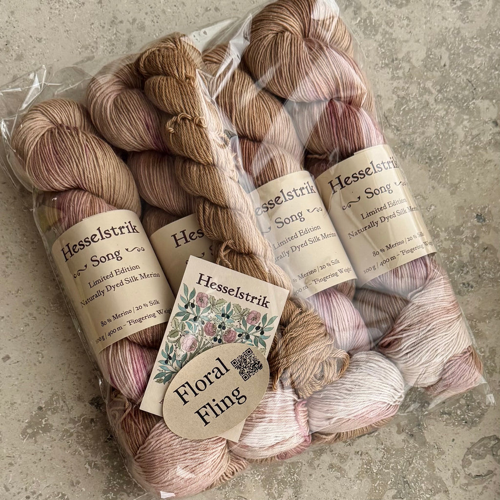 En t-shirt med små blomsterknopper, der er skabt af assigned pooling. Strikket i Hesselgarn Song, men med halskant og opslag i Silk Song (mini fed)