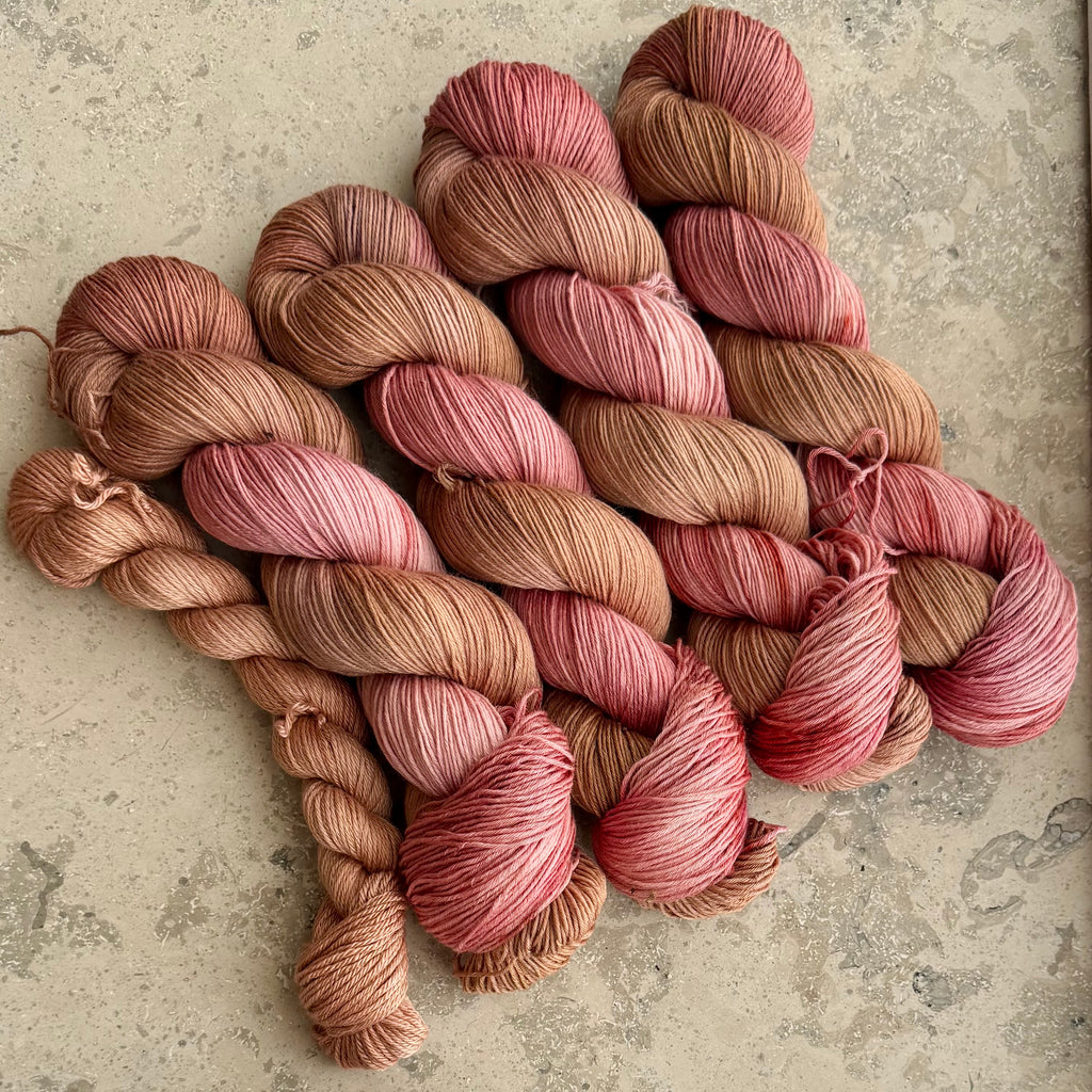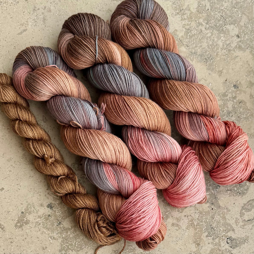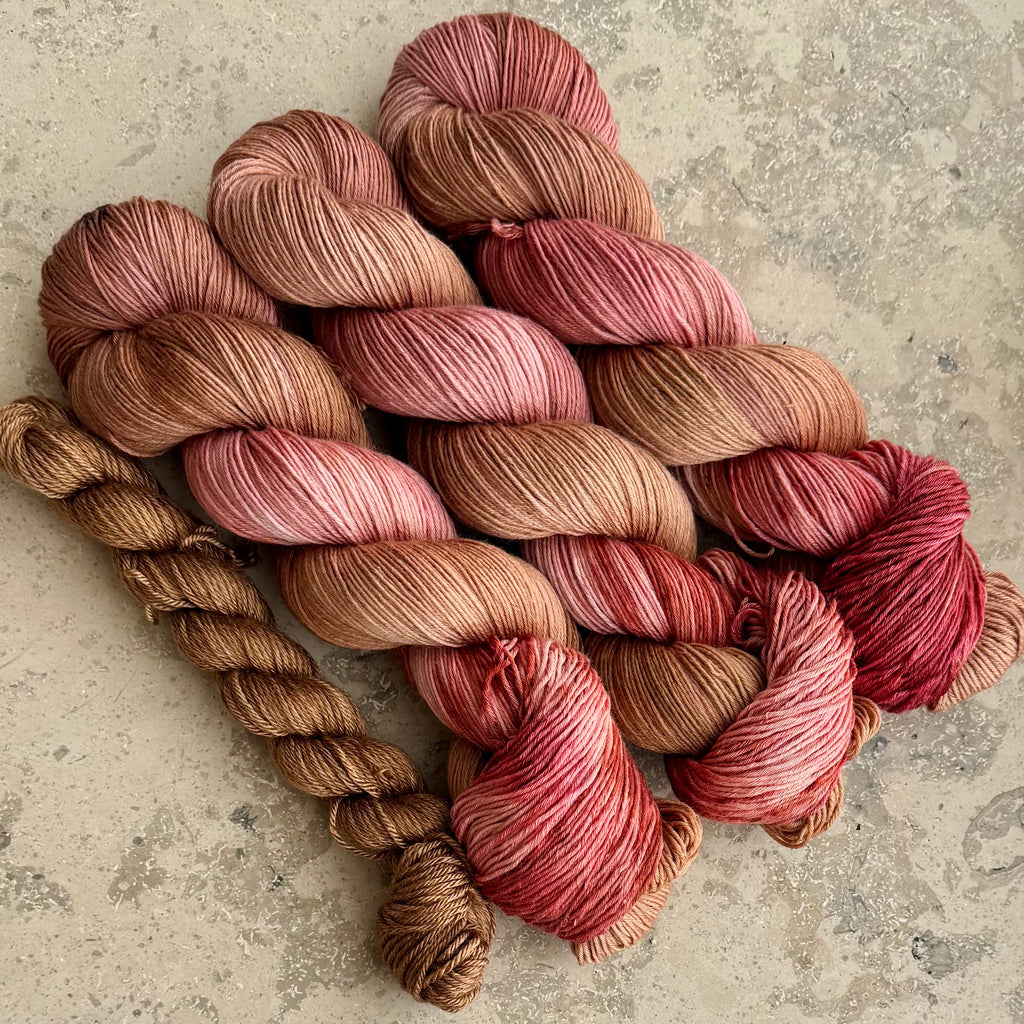 En t-shirt med små blomsterknopper, der er skabt af assigned pooling. Strikket i Hesselgarn Song, men med halskant og opslag i Silk Song (mini fed)