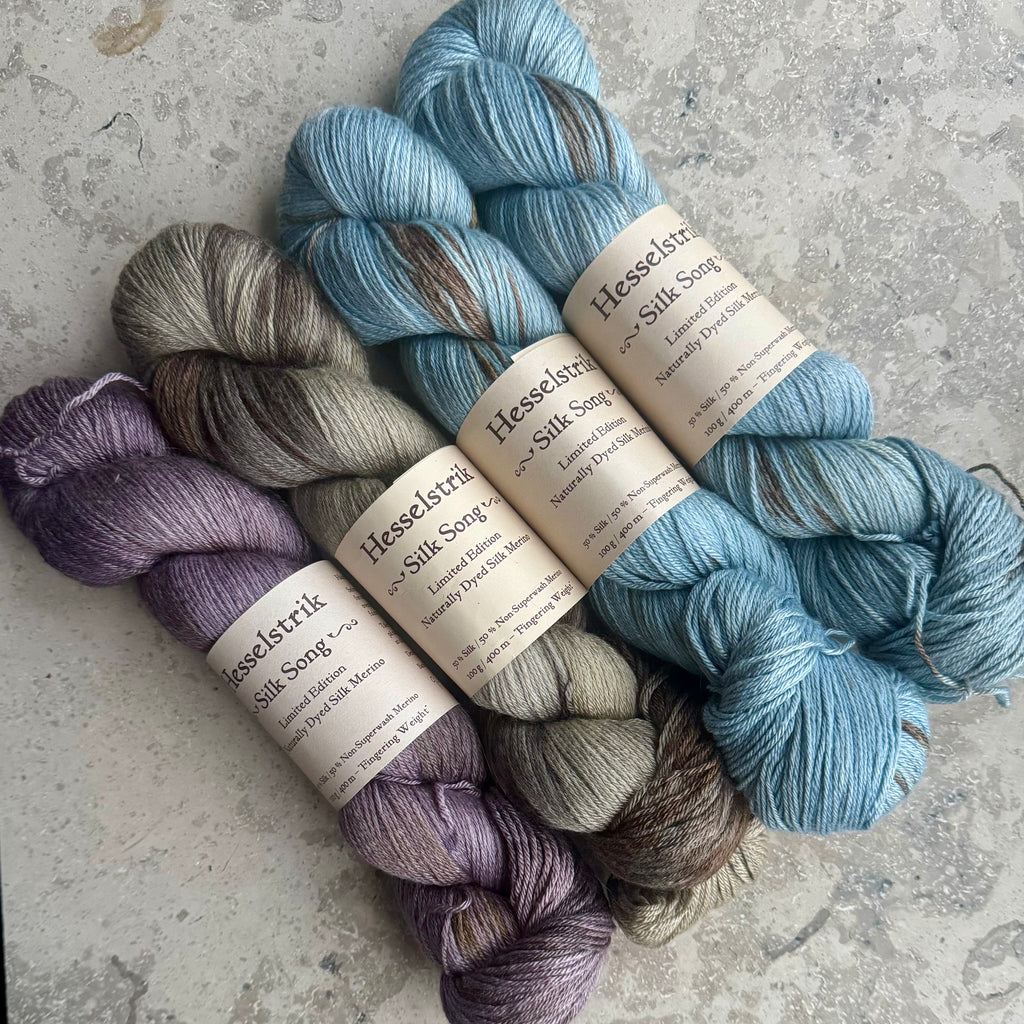Strikkes i Hesselgarn Silk Song, et superblødt non-superwash garn i 50/50 merino/silke, 100g/400m